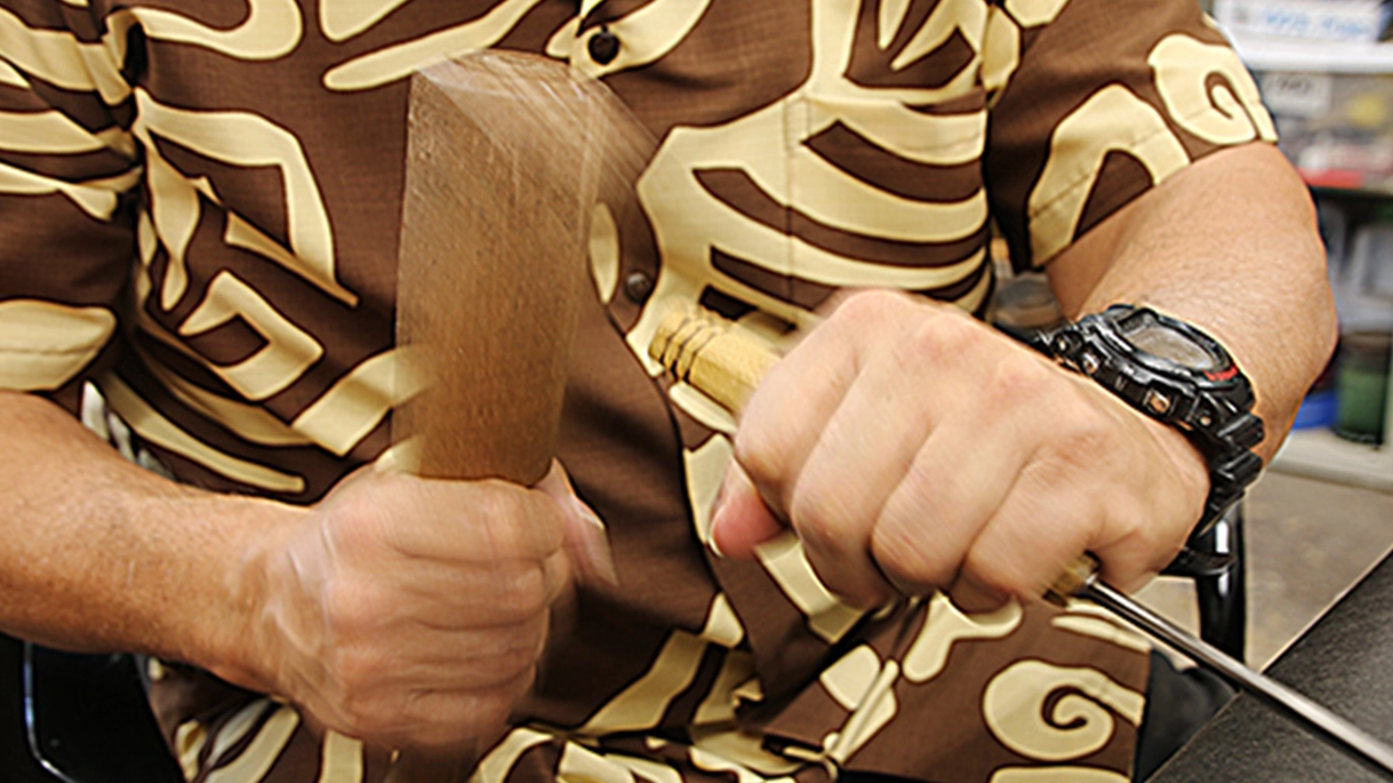 “It turns out that smoother lines usually result from faster taps that drive the chisel ahead in shorter increments,” he said. “One of my student workers sounds like a woodpecker.” - Chain saws: Polynesians have always been innovative when it comes to using the materials and tools at hand, and some carvers like using chain saws of varying sizes to rough-shape their creations.