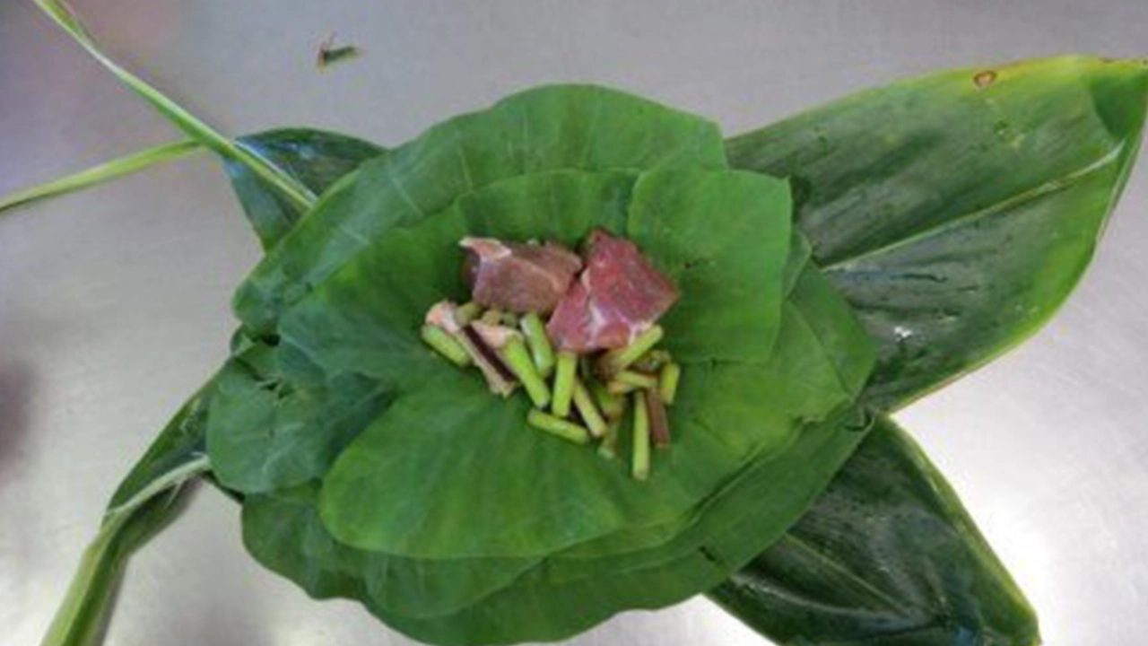 - Place the bundle on the end of a ti leaf and wrap tightly. Fasten using rubber bands or toothpicks. Repeat steps until all bundles are made.