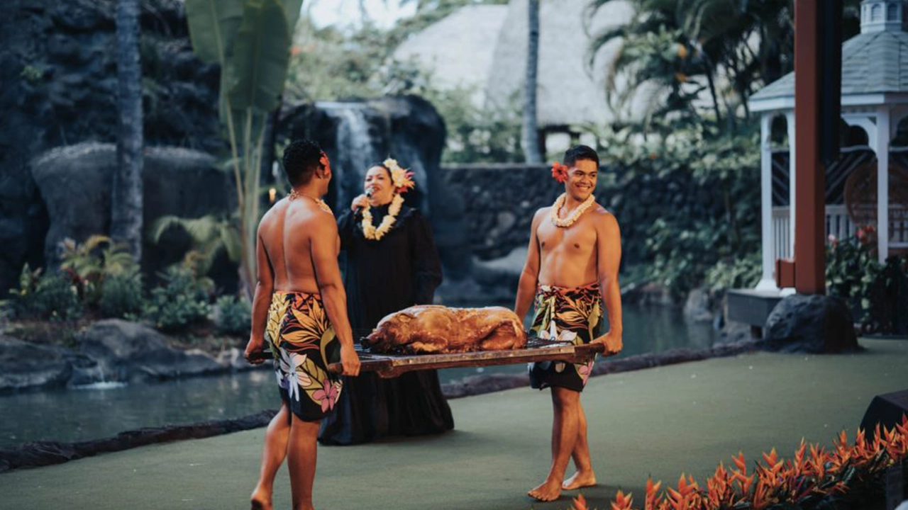 This lūʻau experience celebration features hula, Hawaiian music, and an authentic kālua pig prepared in an imu (underground oven). It honors Hawaiian aliʻi (royalty) and is a feast for the senses. Guests are welcomed with a lei greeting and dine surrounded by tropical foliage in the open-air Hale Aloha or Hale ʻOhana.
