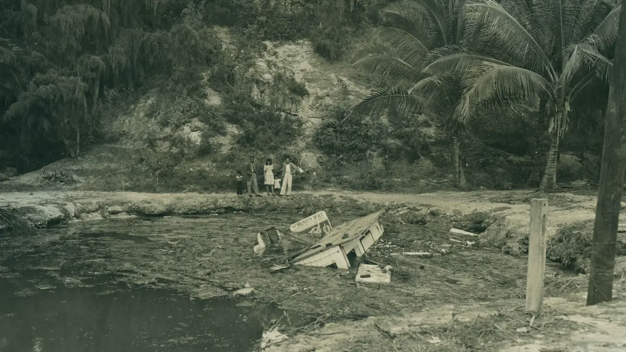 Gladys remembered that her father came home yelling “tidal wave, tidal wave.” Her mother took the children up the mountain, but Gladys didn’t join them. “As soon as they left I was out the gate and down the walkway past the school. I jumped over the wall and found myself ankle-deep in water.” This was the first wave.