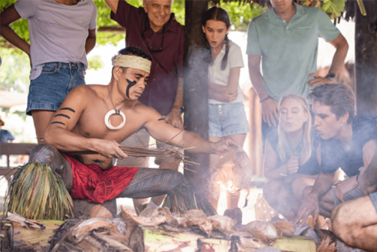 Participate in exciting cultural presentations and fun hands-on activities. Learn ancient games, skills, and traditions such as making tapas from bark, weaving baskets from leaves, throwing spears and more.